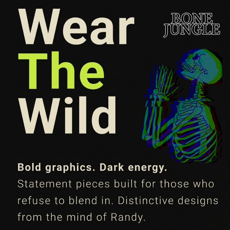 Bold graphics, dark energy, and designs that don't belong anywhere — which is exactly why they belong on you. Every piece is made from the mind of Randy and shipped into a world that probably wasn't ready for it.